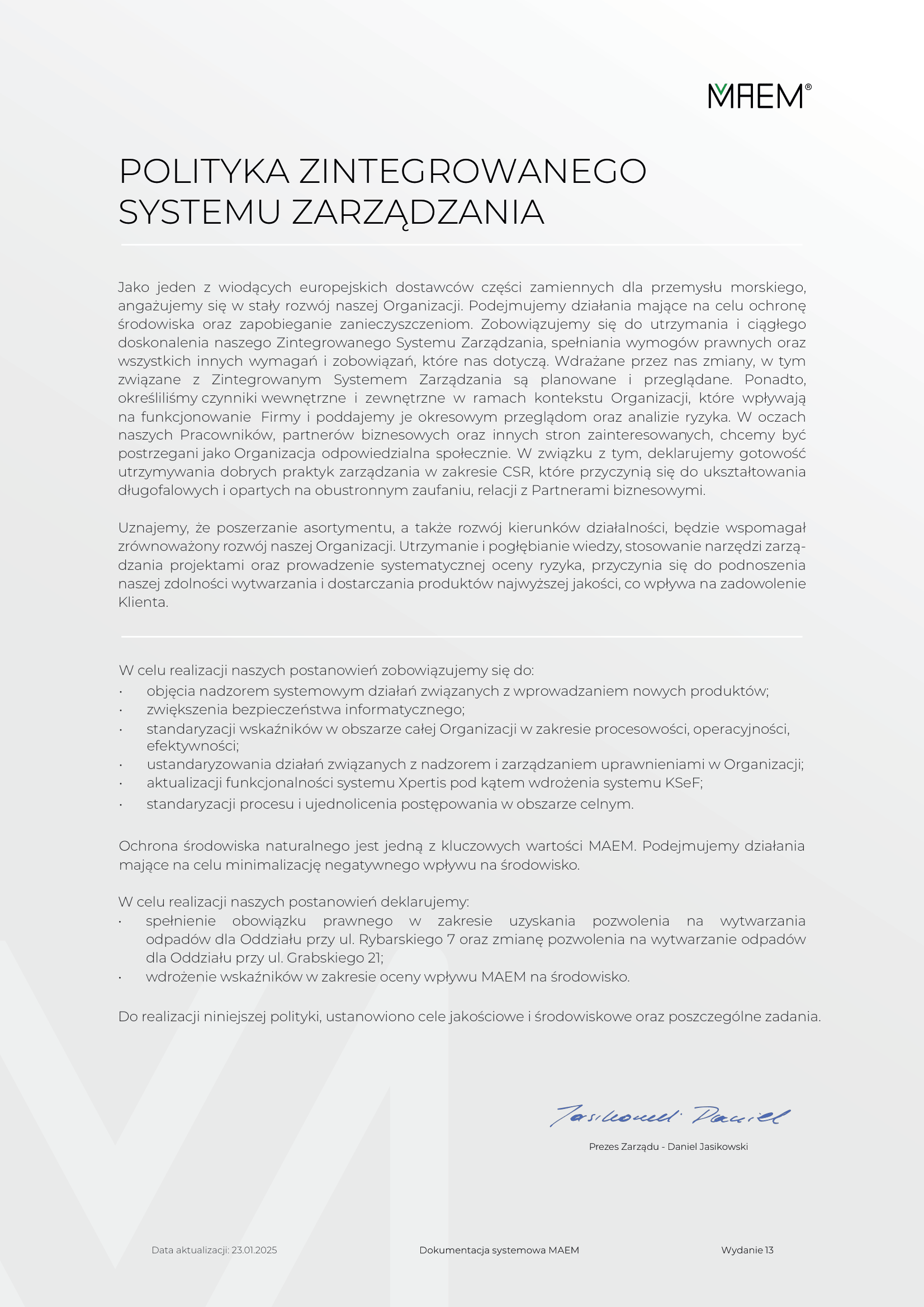 Navigation PL EN O nas Asortyment Produkcja Jakość Wsparcie Klienta Strefa Klienta Fakty i Mity Webshop Kontakt Polityka Zintegrowanego Systemu Zarządzania MAEM - aktualizacja Zapraszamy do zapoznania się z niniejszą zaktualizowaną Polityką Zintegrowanego Systemu Zarządzania MAEM.